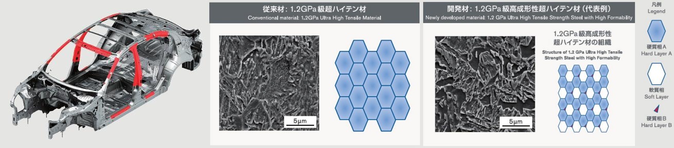 | 特徴 | 鋼板は一般的に強度を高めると成形性が低下し、また鋼板中の炭素量が多くなるため、スポット溶接強度が確保しにくい傾向にある。 開発材では、硬質相と軟質相の組織分率を最適化する緻密な材料組織制御により、高強度かつ高延性を実現。スポット溶接では、加圧力と電流、通電時間を高度に制御する独自プロセス確立により、接合強度を確保した。 |