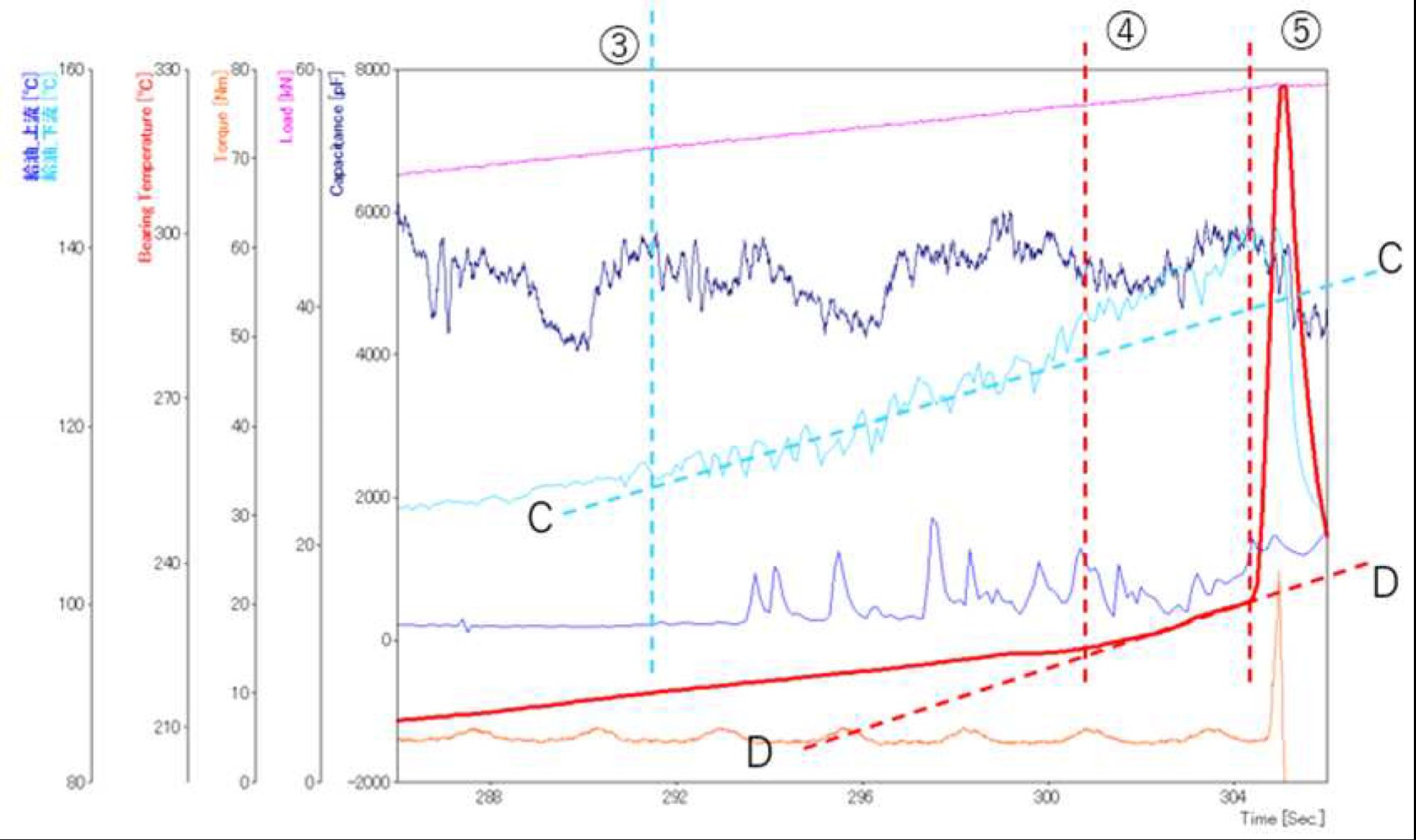 幸島ら(2)はエンジンの軸受が焼き付く直前に軸受入口の供給油温が上昇することを発見し、そこから軸受の焼き付きメカニズムを推測している。軸受の単体試験機を用い、軸と軸受を電極と見なした静電容量法による油膜厚さ測定、軸と軸受間の電気抵抗測定による金属接触有無の測定、オイル入口、摺動面下流、摺動部付近の油温および軸受温度の測定を行っている。図2および図3に測定結果を示す。黄色の線が軸の駆動トルクを示しており、右端の値の急上昇が焼き付きの発生を示している。グラフ上方の紺色の線は静電容量法により求めた軸と軸受のクリアランスを示しており、ピンクで示す負荷の上昇と共に値が増加しクリアランスが小さくなっている様子が示されている。しかし、焼き付きが発生する数秒前に値が減少し、軸と軸受間に存在する物質の静電容量に変化があった可能性が示されている。これと時期を同じくして油温や軸受温度の上昇が見られる。この時点で試験を停止した場合には、軸受表面に損傷が無かったことから、この温度上昇は焼き付きによるものではない。さらに同時に軸受へのオイル入口ではオイルの逆流が確認されている。これらのことから、摺動により発生する熱が冷却により奪われる熱より過剰となることで熱暴走がおき、オイルが沸騰することで焼き付きが発生しているとの仮説が示された。軸受の焼き付きメカニズムの解明は大きな課題であるが、本研究はそれに対し非常に重要な知見を与えるものと考えられる。
