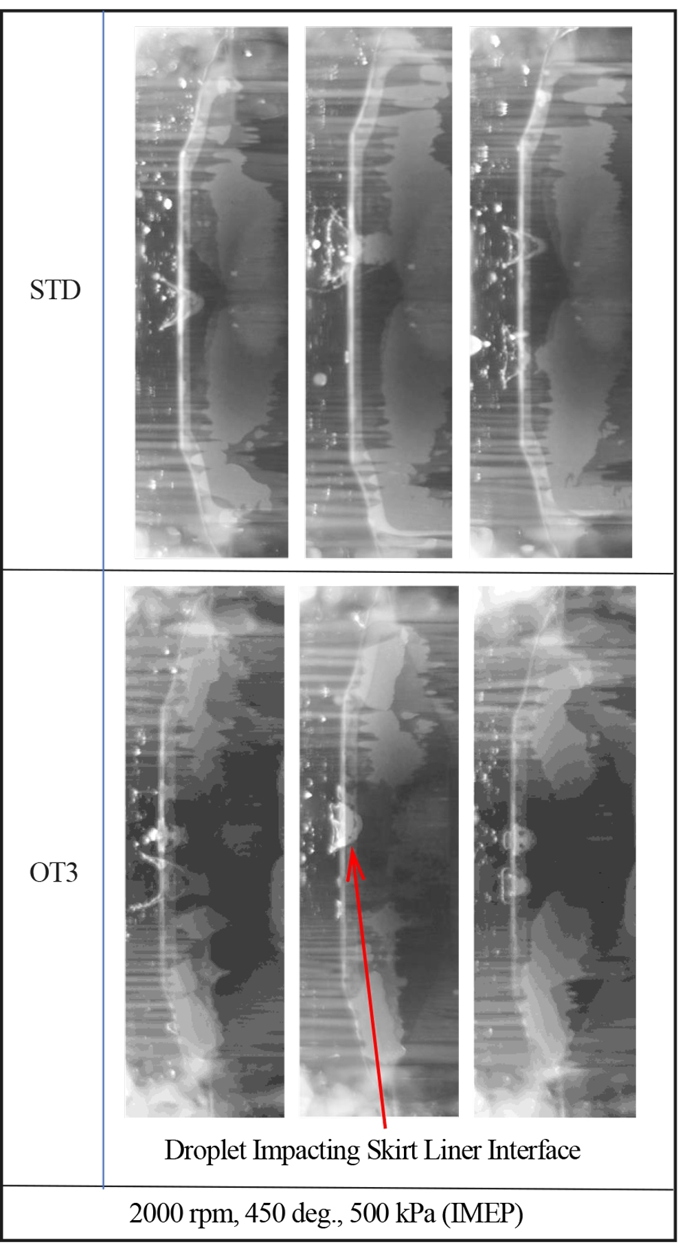 陣内ら(3)はピストンスカートにオイルが供給されるルートについての解析を行っている。このためにはシリンダに付着する油膜の厚さの特定が重要となるが、これをガラスシリンダを用いてLIF(Laser Induced Fluorescence)法で測定している。LIF法では、摺動面がオイルで満たされている場合は問題ないが、気相が含まれる場合の校正が課題である。気相を含む佼正のためには金属表面に付着した油膜の厚さを特定する必要があるが、本研究では図4に示す工夫によりこの課題を解決している。測定結果によりピストンスカートにはシリンダに付着したオイルだけで無くクランクシャフトからはねかけられた液滴も供給されている様子(図5)や、オイルリング溝に設けられた油穴から供給されている様子が示された。ピストンスカート部の供給油量の特定は重要な課題であるが、本研究はその一助となるものと考えられる。