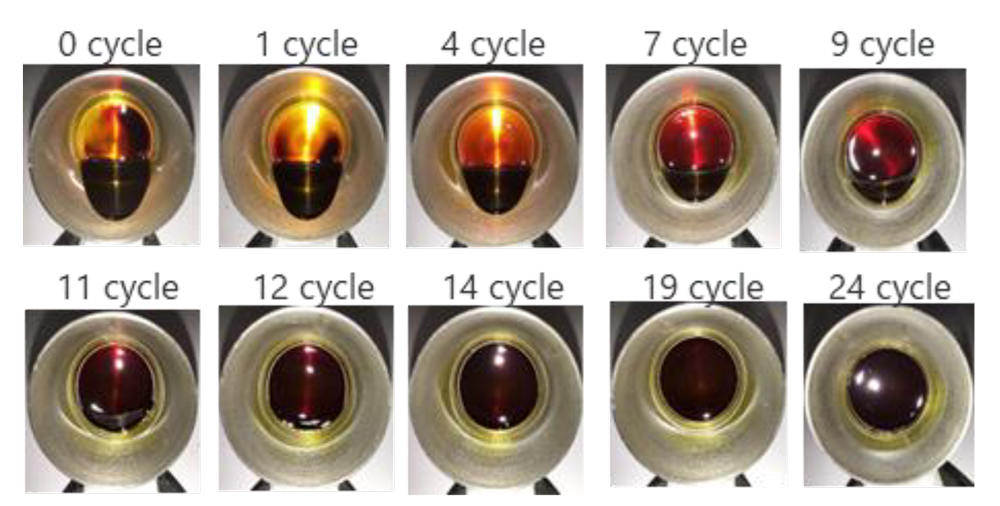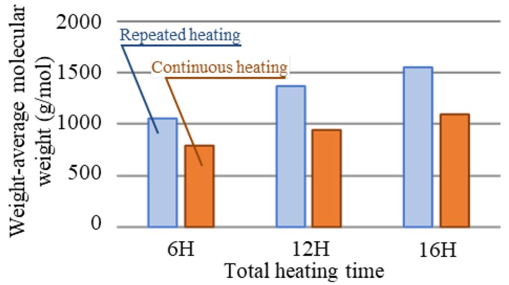 加熱と冷却を繰り返すサイクルで評価したところ、当初流動性を示していたデポジットは次第に硬化した(図1)。またこのデポジットはトータルの加熱時間が長いほど粘弾性率が高く(=硬化しており)、また、連続加熱よりも加熱と冷却を繰り返す方が硬化することが示された(図2)。