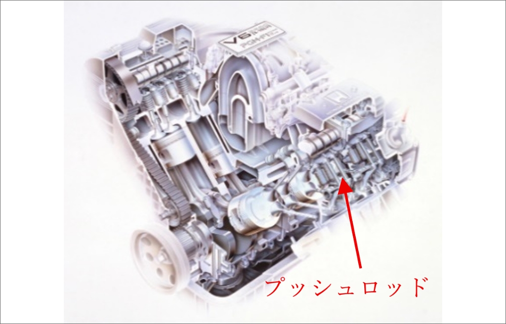 1985年11月に発売されたホンダのフラグシップモデル「レジェンド」(図1)には、同社初となる量産V型6気筒エンジンが新規開発され搭載された。このエンジンは、筆者が入社して最初に開発担当したエンジンである。エンジンの幅と高さのバランスを最適化するため90度のVバンク角を採用し、クランクピンには30度のオフセットを設けることで等間隔燃焼を実現している。搭載されたエンジンは、排気量2.0LのC20A型および2.5LのC25A型の2種類であり、いずれも1本のカムシャフトで吸排気4バルブを駆動するSOHCヘッドを採用している。インテークマニホールドをVバンク間にレイアウトすることでエンジン全体のコンパクト化を図り、シリンダヘッドの形状は横から見ると「おむすび」に似ていることから「おむすびヘッド」と呼ばれていた。動弁系にはSOHC1カム4バルブのスイングアーム方式を採用し、排気側はプッシュロッド(図2)でロッカアームを駆動するという独創的なアイデアが盛り込まれている。また、高性能を追求した市販乗用車として、静粛性とメンテナンスフリー性を両立するため、ハイドロリック・ラッシュ・アジャスタ(油圧タペット)が採用された。さらに2.0Lエンジンには、低速トルク向上を目的として、超ロングでカタツムリのような形状を持つ可変管長インテークマニホールドが採用されるなど、数多くの新技術が投入されていた。その後、1987年に2.7Lへの排気量拡大、1988年にはガソリン量産車として初めて可変ベーン機構ターボを採用した2.0Lウイングターボエンジンが登場した。さらに1990年にはDOHC VTEC化と3.0Lへの排気量アップが行われ、後述するNSXへと技術が継承されている。