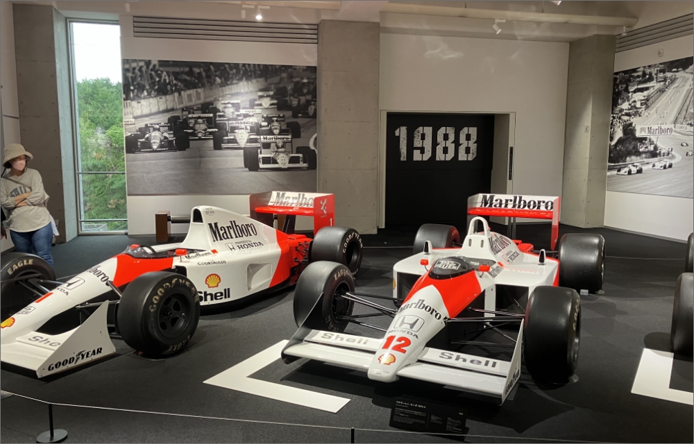 1983年のF1第2期活動開始から、ホンダはF1用1.5L V6ツインターボ・エンジンの開発を継続し、1987年にはRA167Eエンジンを開発した。このエンジンはウイリアムズホンダFW11B(図3)に加え、アイルトン・セナが所属するロータスにもエンジン供給を開始した。FISA(国際自動車スポーツ連盟)は、高出力化競争に歯止めをかけるべく、それまで無制限であったターボチャージャの過給圧を最大4.0barに制限した。しかしホンダは、さらなるパワーアップを目標とする技術戦略を立て、燃料の気化性を考慮し適温に制御する吸入空気温度コントロールシステムを新規導入し、充填効率向上と高回転・高圧縮技術の進化により、予選時に1000馬力超を達成。この年のシーズン全16戦中11勝、初のダブルタイトル獲得によりホンダエンジンの技術的優位性を証明した。1988年、マクラーレンホンダ MP4/4では、図4右に示すゼッケン No.12 を駆るアイルトン・セナと、同チームのアラン・プロストの両ドライバーにより、全16戦中15勝という圧倒的な成績を収め、この年のF1を席巻した。この快挙はホンダ製V6ターボエンジンRA168Eの高い性能に支えられていた。翌1989年にはF1のエンジン規定が大幅に変更、ターボエンジンが禁止され、以降は全車3.5L自然吸気(NA)エンジン搭載となった。この年のMP4/5(動画1)はNAエンジンに刷新となり、V10のRA109Eを搭載している。将来的にはV12への発展を視野に入れつつ、高回転・高出力思想に基づいたエンジンであった。このRA109Eは、エンジン規定が大幅変更されたにもかかわらず高い競争力を維持し、コンストラクターズとドライバーズのダブルチャンピオンを獲得した。1991年にはV12エンジンRA121Eを搭載したMP4/6(図4左No.1、動画2)が投入され、ホンダ可変吸気管長システムを採用し、12気筒の課題であった重量は軽量化により、V10比で5.5kg軽量化された154kgのエンジン質量を実現した。この年もコンストラクターズとドライバーズのダブルチャンピオンを獲得している。