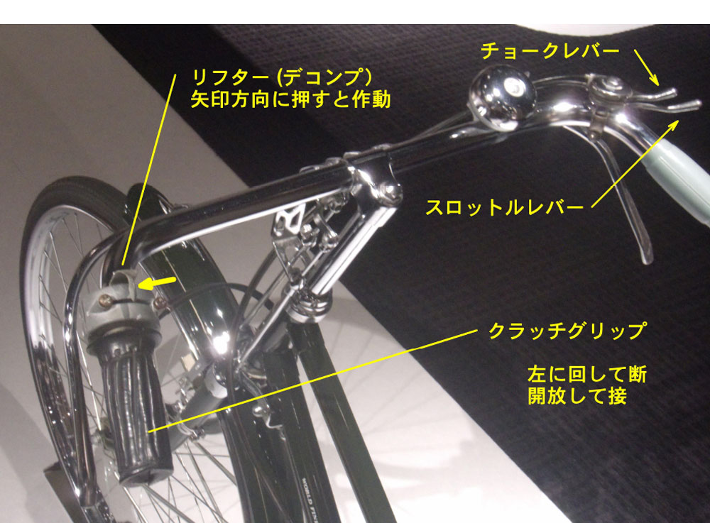ハンドル右手のスロットルとチョークレバーは当時一般的であったが、左手には、バネに逆らって回すとクラッチが切れるグリップと、バネに逆らって倒すとシリンダヘッドのバルブを”開”にしてデコンプ動作*1ができるリフタ(?)レバーが一体になったものがついていた(図2)。クラッチ”断”でこぎ出し、速度が出たところでデコンプ状態でクラッチ”接"にした後、非デコンプ状態にすることでエンジンがかかる。しかし、冬の始動時にチョーク*2のかけ方を失敗すると、プラグが”かぶって”しまい悲惨であった。スパークプラグをチェックし清掃/交換をするべきであるが、時間がないので、デコンプ状態でペダルをこぎ続け、掃気しては非デコンプにしてエンジンの始動を試みる(誤使用かも知れないが当時はそのようにしていた)ことになり、運が悪いとこれを繰り返しているうちに学校に着いてしまうこともあった。デコンプ状態でシュッシュと目立つ音が出るので友人の注目を集めてしまいながら、汗びっしょりでペダルをこいでいたのを思い出す。慣れてきて、早めに諦めてクラッチを切って走行することもあったが、汗をかくのは同じであった。