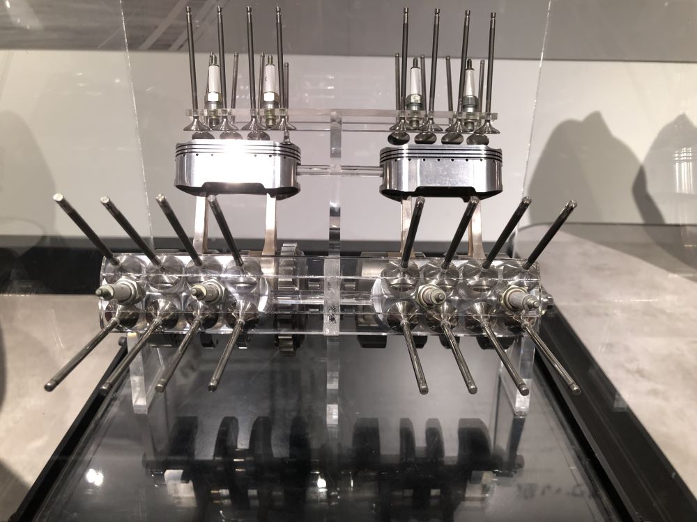 アクリルボックスの中に展示されているのは、四つの奇妙な形をしたピストンに32本の給排気バルブ、8本の点火プラグと8本のコンロッドで構成されたV型4気筒エンジンである(図4)。