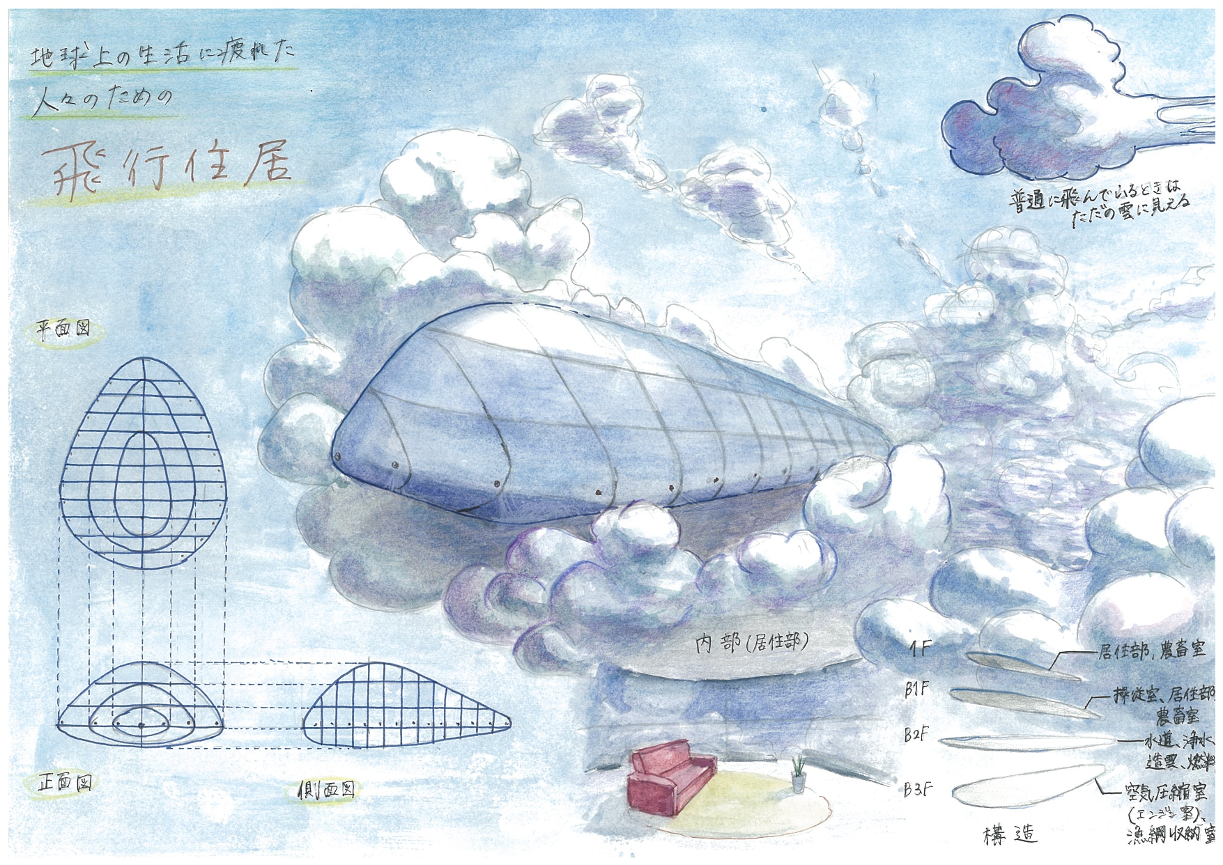 | 審査員特別賞 | 竹野 碧 | 地球上の生活に疲れた人々のための飛行住居 |